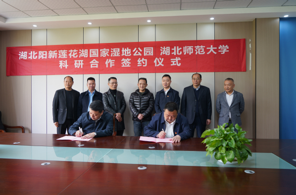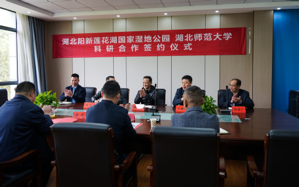 王磊首先对城市与环境学院领导的到访表示热烈欢迎。他表示,与湖北师范大学的科研合作,将为莲花湖生态修复带来新一轮宝贵契机和强有力技术支撑。会上,双方就各自基本情况、发展优势和需求进行了深入交流。双方一致认为,两者可在湖泊湿地修复与保育和人才培养等方面进行全面合作,实现优势互补、合作共赢。王湖坤与黄勇共同签订了科研合作、实习基地协议。会后,杨应华与王磊共同为“湖北师范大学湖北阳新莲花湖国家湿地公园科研基地”和“湖北师范大学实习实训基地”揭牌。