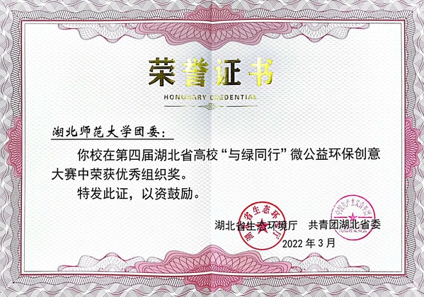 本网讯  近日,湖北省第四届“与绿同行”微公益环保创意大赛获奖结果公布。校团委获优秀组织奖,学校“一路黔行”志愿服务团获得二等奖,数统学院“长风破浪队”和城环学院水环境生态修复实验室获得入围奖。