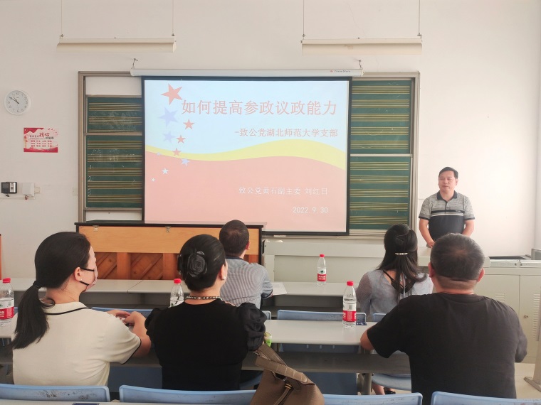 本网讯 为切实履行好参政议政职能,进一步提升支部参政议政热情和撰写社情民意信息能力,9月30日,致公党湖北师范大学支部举办参政议政能力提升培训会。致公党黄石市委会副主委刘红日教授应邀进行专题讲座,会议由支部主委袁蓓主持。