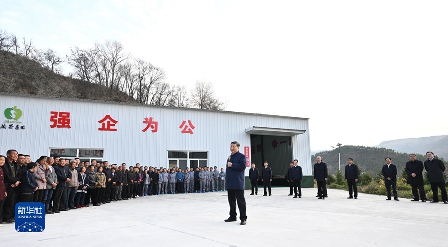 车间外,老乡们聚集在一起,高声向总书记问好。习近平同老乡们拉起家常,回忆当年他在陕北的知青岁月。习近平对老乡们说,我在陕北生活了7年,当年看到老乡们生活很艰苦,心里就想着怎么样让大家生活好起来。这次来延安,看到一派硕果累累的丰收景象,交通条件大为改善,发生了翻天覆地的变化。过去陕北老乡们修梯田、种庄稼,面朝黄土背朝天,抡起老锄头干活,广种薄收,十分辛苦,如今山坡上退耕还林种上了苹果,老乡们有工作、有稳定收入,孩子有好的教育,老人都有医保,生活越来越好。从陕北的变化就可以看到中国的变化。习近平指出,现在,“两个一百年”奋斗目标的第一个百年目标已经实现,绝对贫困问题解决了,老乡们过上了好日子,但还要继续努力往前走,让生活越来越美好。陕北的气候、光照、纬度、海拔等非常适宜发展苹果种植,加上滴灌技术、矮化种植技术、选果生产线等不断发展,就地卖出,销路不愁,大力发展苹果种植业可谓天时地利人和,这是最好的、最合适的产业,大有前途。习近平强调,中国共产党是人民的党,是为人民服务的党,共产党当家就是要为老百姓办事,把老百姓的事情办好。空谈误国,实干兴邦。要认真学习贯彻党的二十大精神,全面推进乡村振兴,把富民政策一项一项落实好,加快推进农业农村现代化,让老乡们生活越来越红火。老乡们爆发出雷鸣般的掌声。
