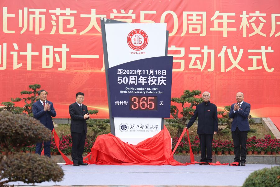 启动仪式上,湖北师范大学党委书记李宏、校长雷儒金,原校领导、中国当代著名寓言大师黄瑞云教授和文学院96届校友周学君一起,为50周年校庆倒计时牌揭幕。