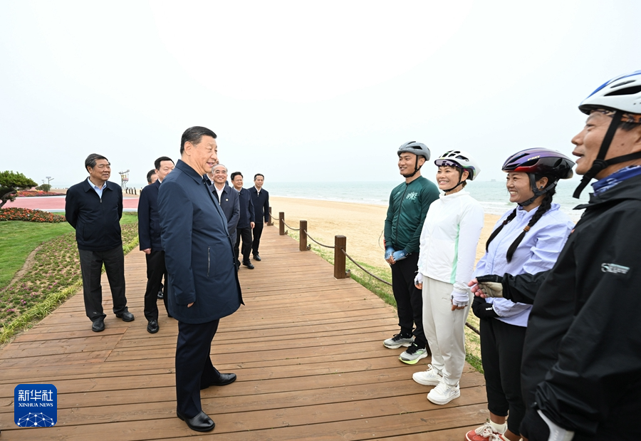 5月22日至24日,中共中央总书记、国家主席、中央军委主席习近平在山东考察。这是22日下午,习近平在日照市阳光海岸绿道同市民和游客亲切交流。 新华社记者 谢环驰 摄