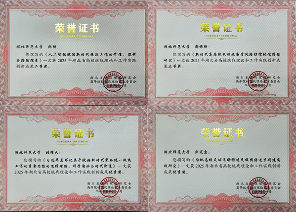 本网讯 近日,湖北省高校统战理论研究会第40次年会召开,会议对2025年湖北省高校优秀统战理论和工作实践创新成果进行了表彰。我校共有4篇论文获奖,其中二等奖1篇、三等奖1篇、优秀奖2篇获奖数量位于全省高校前列。