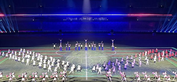 第三篇章《逐梦》:编导团队将舞蹈与体育啦啦操有机融合,实现“美”与“力”的深度碰撞,迸发出“1+1>2”的舞台效果。演员们以整齐的动作、饱满的状态演绎出兼具艺术性与竞技性的原创舞蹈,传递团结拼搏的体育精神,赢得现场观众与赛事组委会的高度赞誉,成为开幕式最亮丽的风景线。