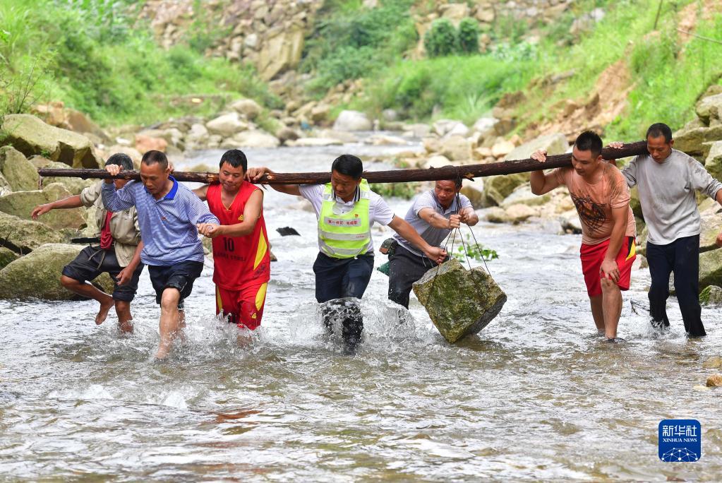 在位于黔桂交界大苗山深处的乌英苗寨,驻村第一书记韦桂华(右四)、党员梁成兵(右三)、梁志新(左二)带领村民维修河堤(2019年6月30日摄)。